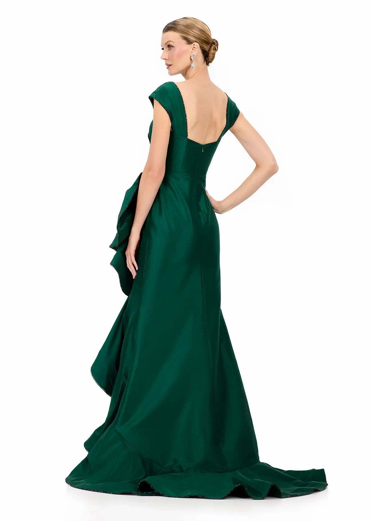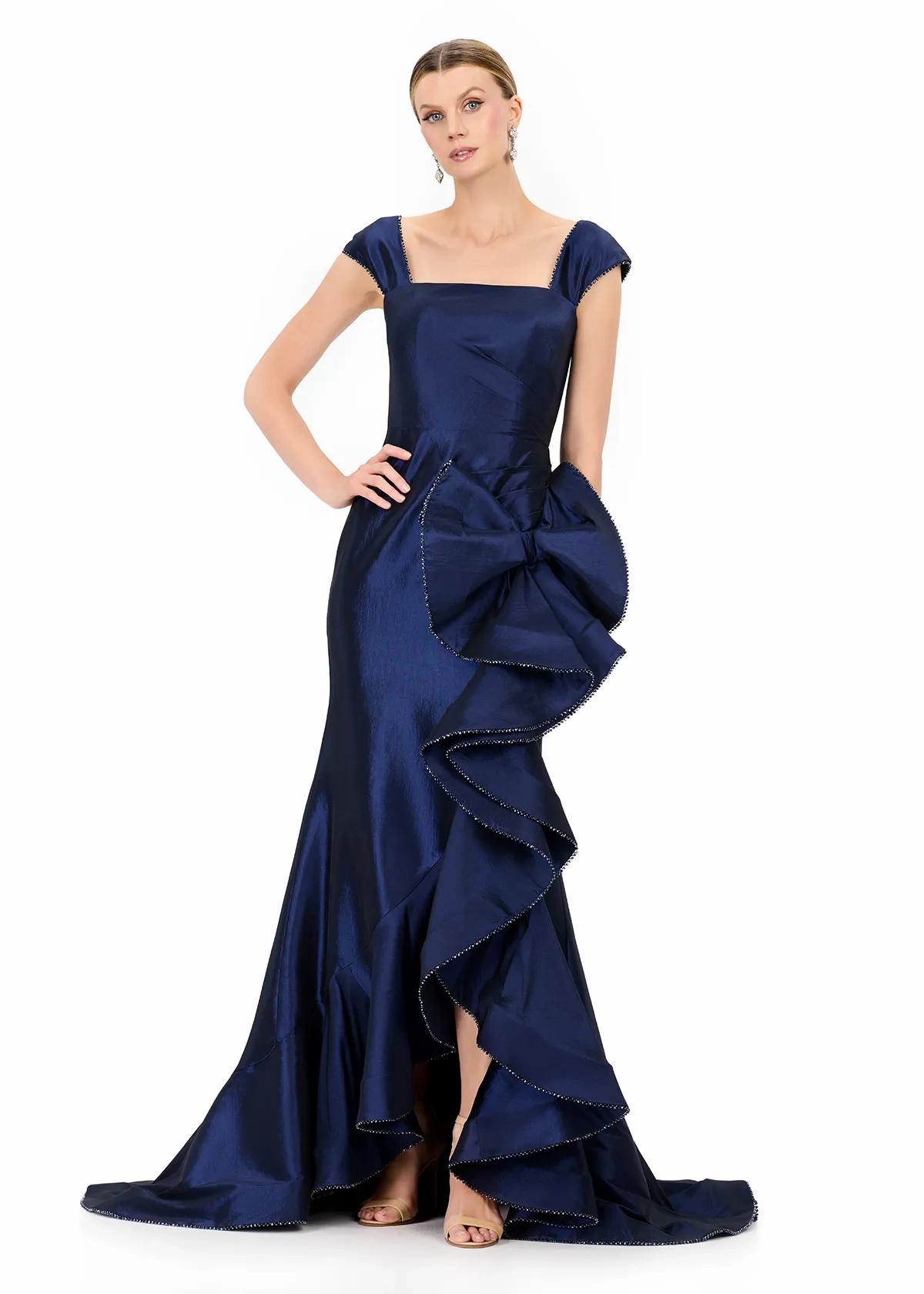 Step into drama and opulence with ASHLEYlauren Style E12321, a show-stopping taffeta gown designed to make an unforgettable entrance. This sculptural masterpiece features luxurious structure, bold ruffle detailing, and a glamorous mermaid silhouette—perfect for the fashion-forward woman who embraces couture elegance.