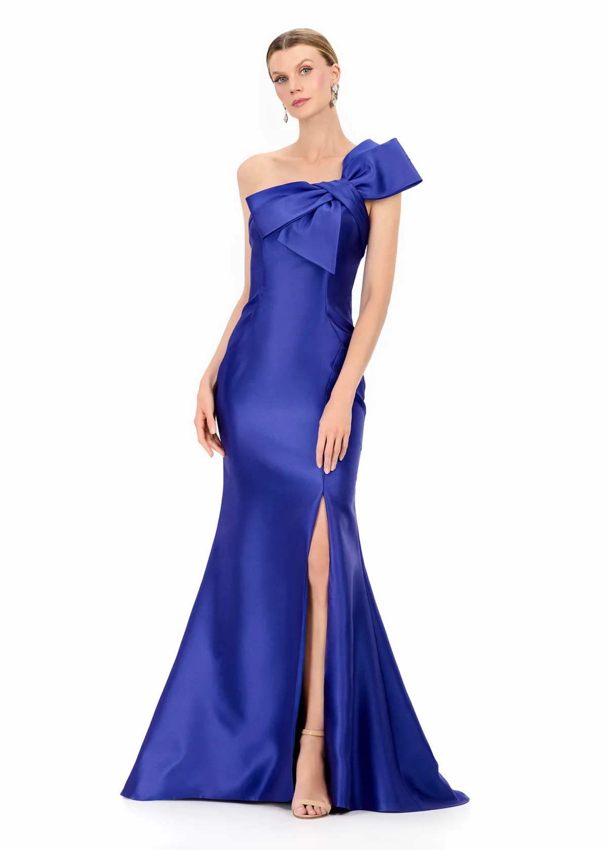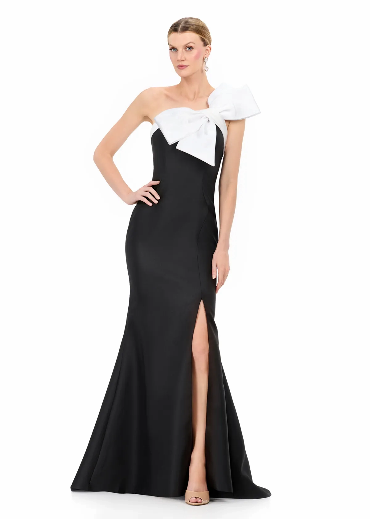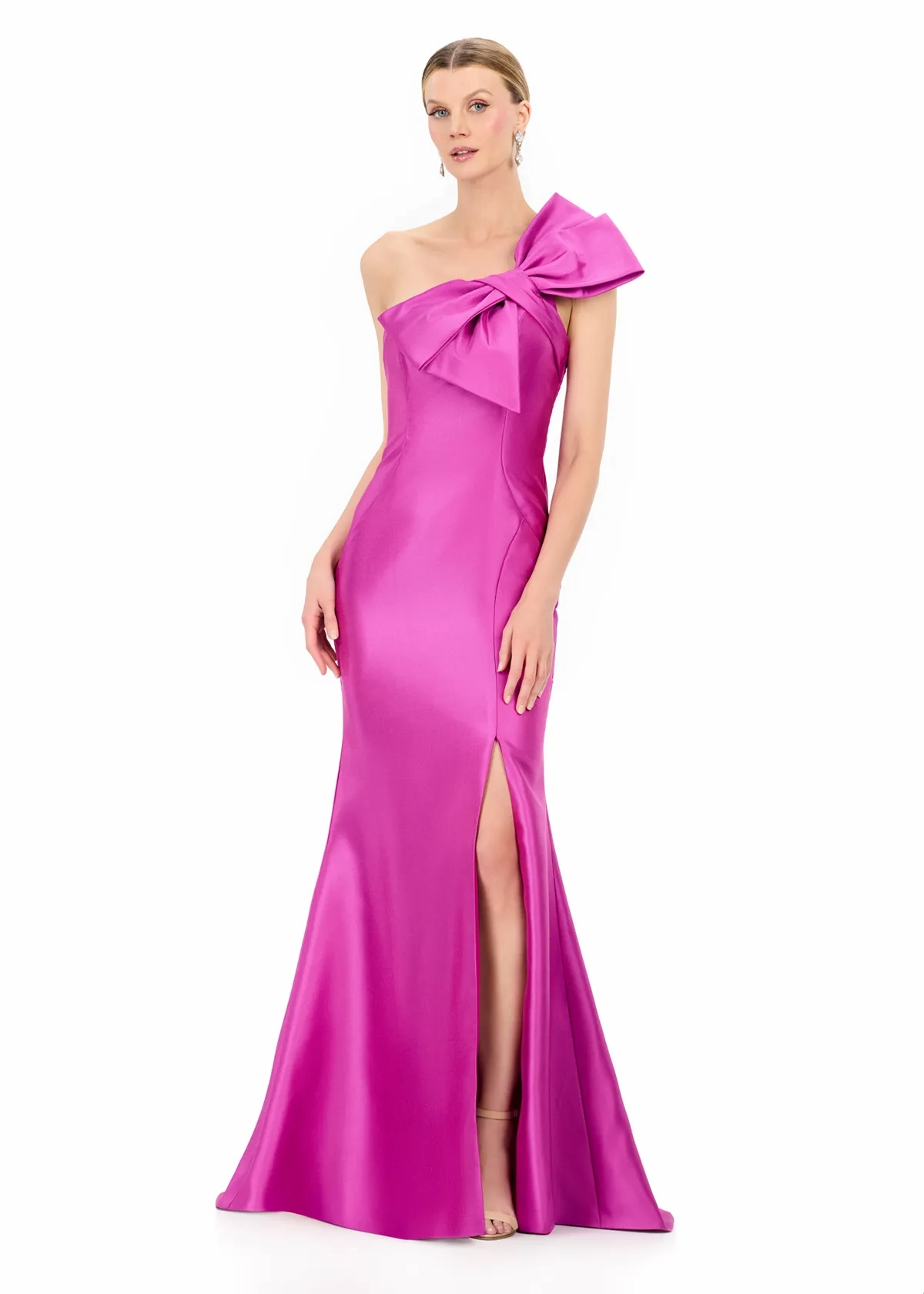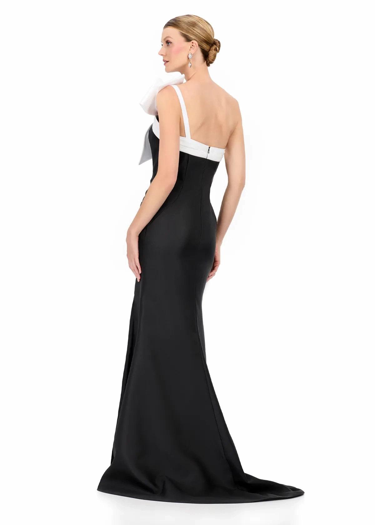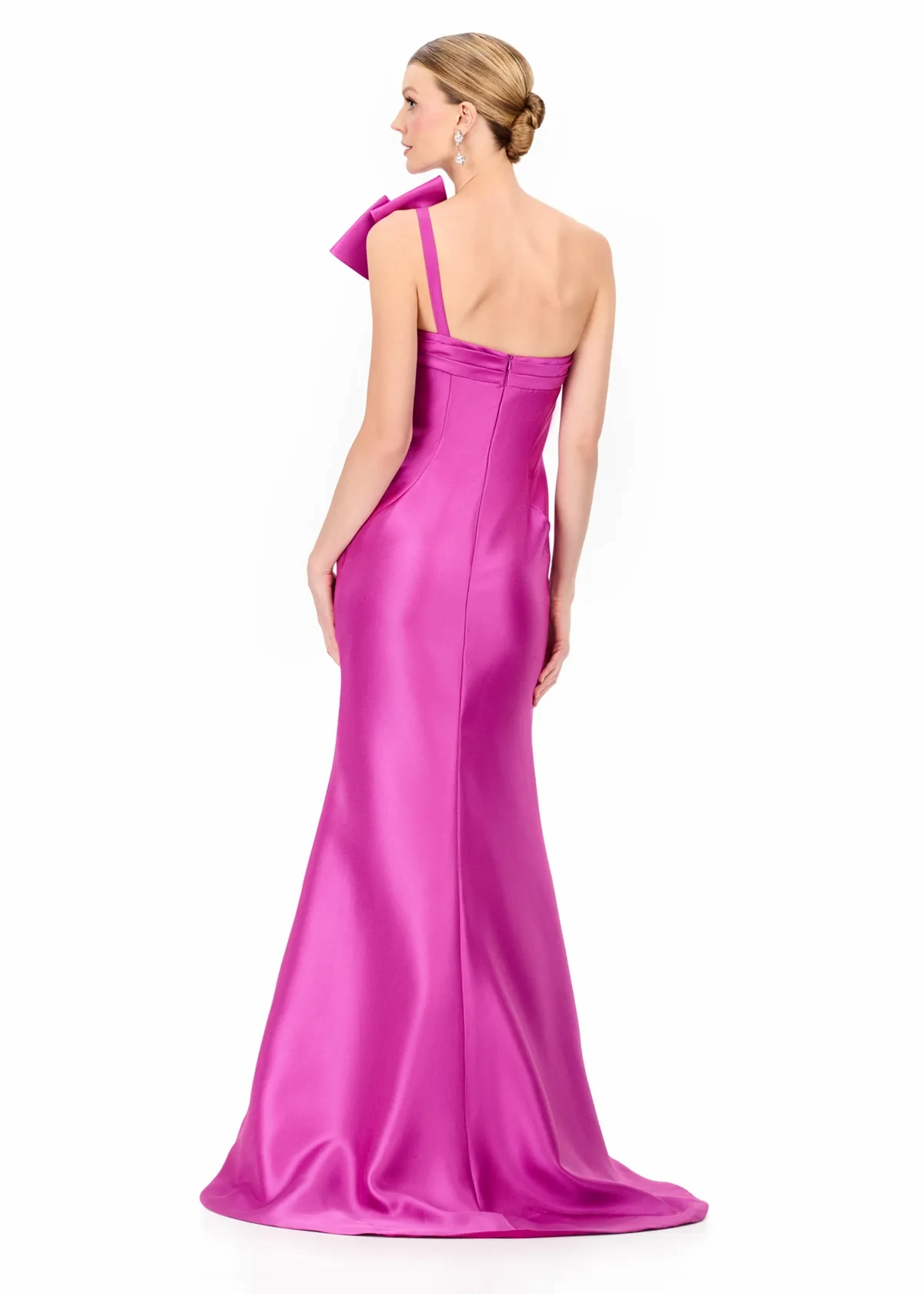 Turn heads and command the spotlight in ASHLEYlauren Style E12325, a sleek and elegant one-shoulder evening gown crafted from luxurious mikado. Designed with a bold oversized bow and flattering fit-and-flare silhouette, this gown delivers high-fashion drama and timeless sophistication for your most glamorous moments.