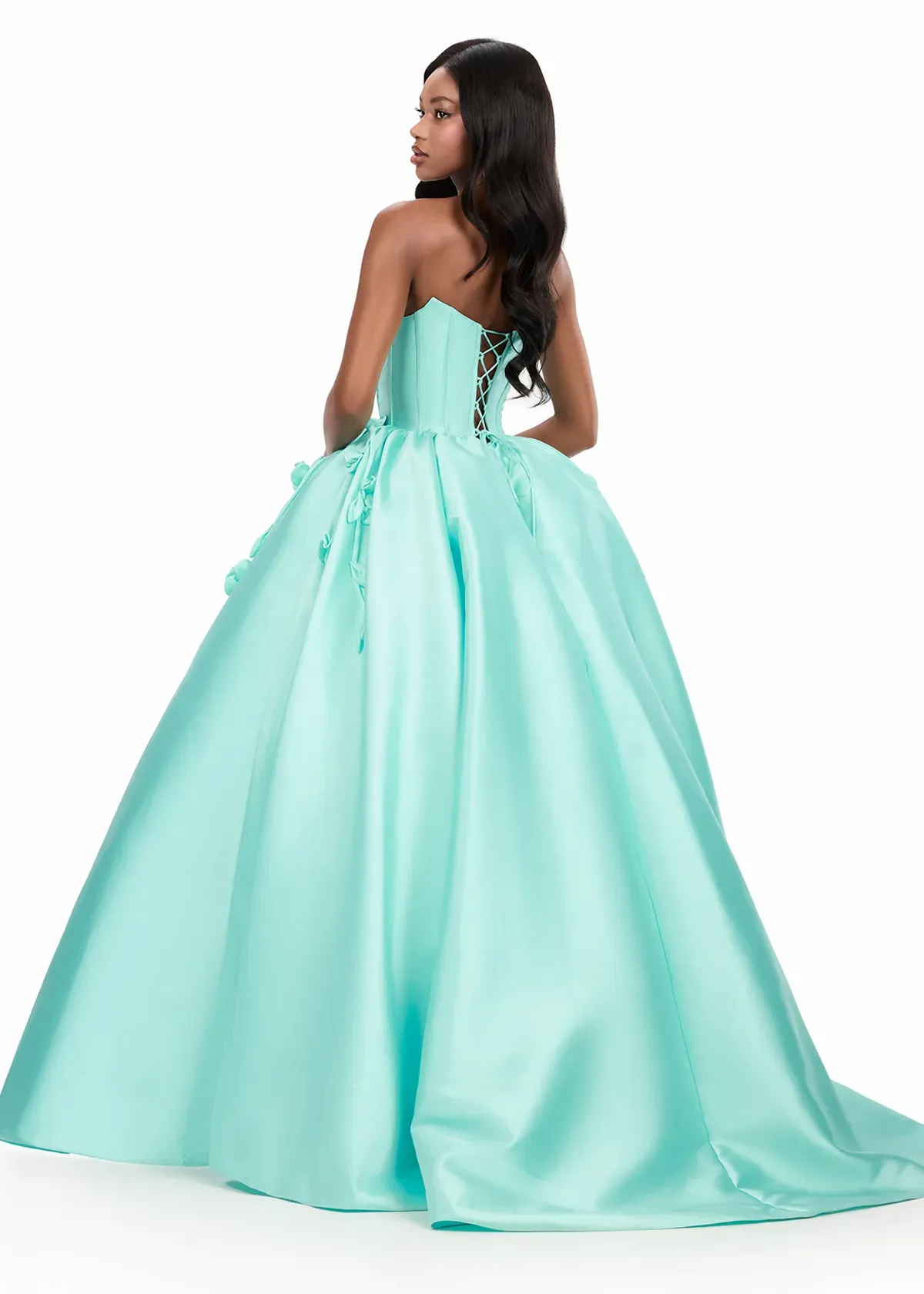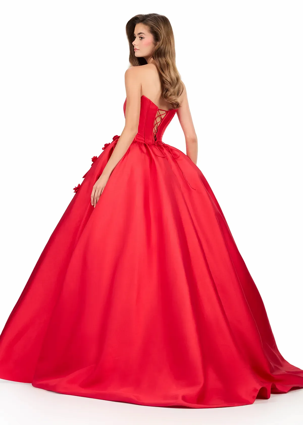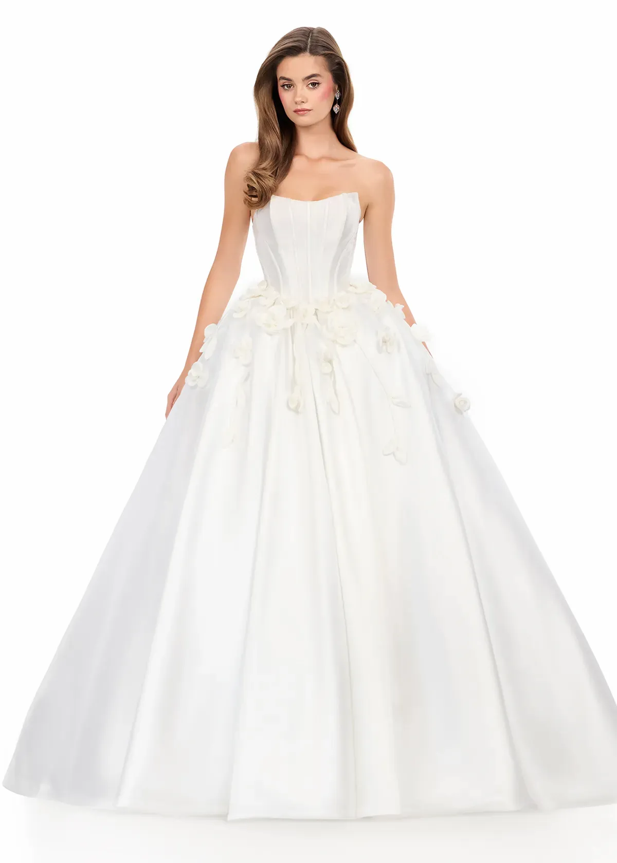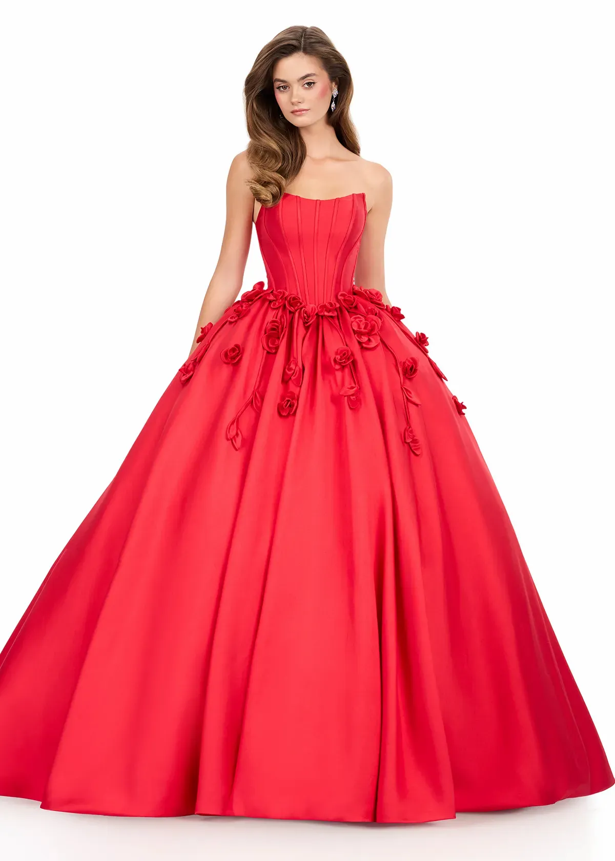 Make a dramatic statement in this elegant ball gown featuring a strapless neckline and full Mikado skirt. ASHLEYlauren Style 12062 features a structured bodice that highlights your natural shape while handmade 3D floral appliqués cascade from the waist, adding a romantic touch. The lace-up back ensures the perfect fit, creating a timeless silhouette ideal for pageants, galas, and formal events.