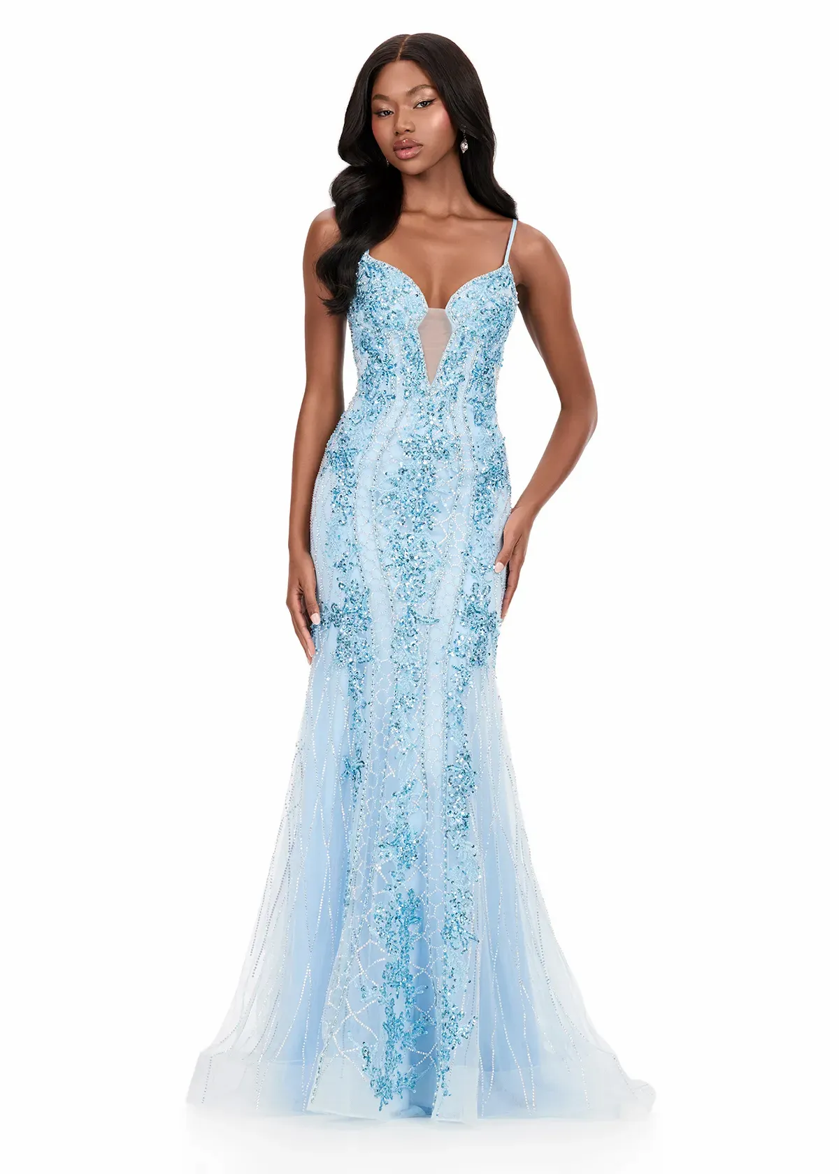 Radiate sophistication in this ASHLEYlauren Style 12221 fully embellished gown adorned with sparkling metallic appliqué details. Featuring a plunging illusion neckline and double straps, this fitted style flows into a dramatic train for a red-carpet-ready moment.