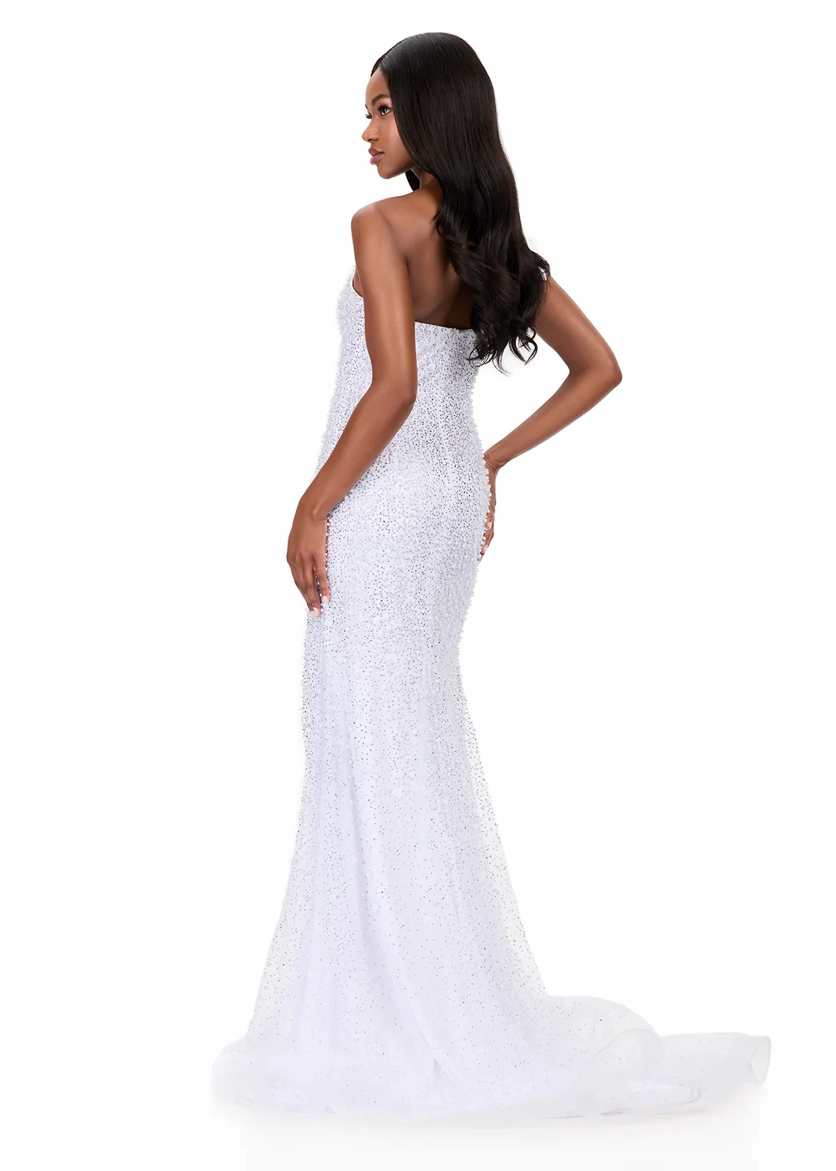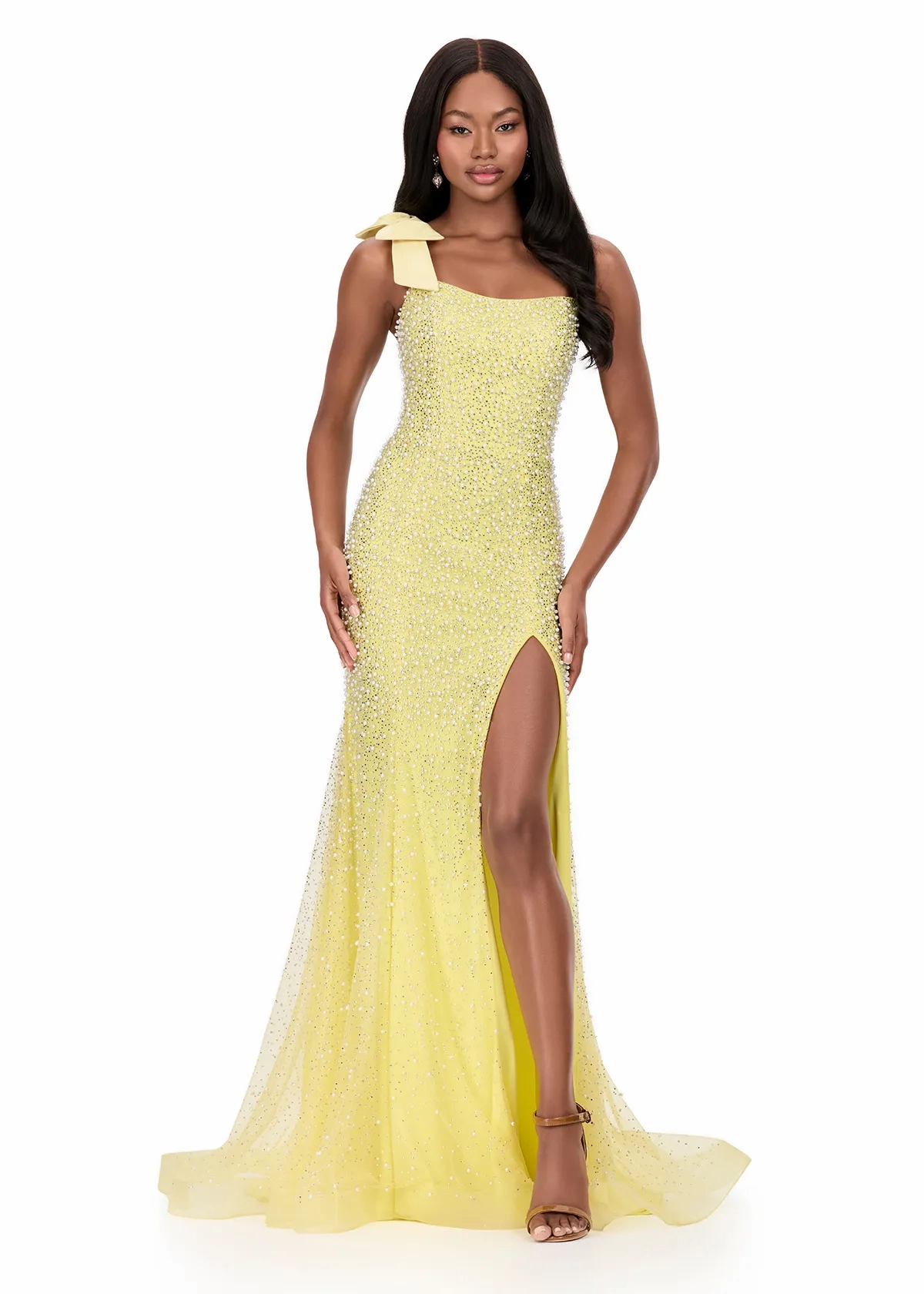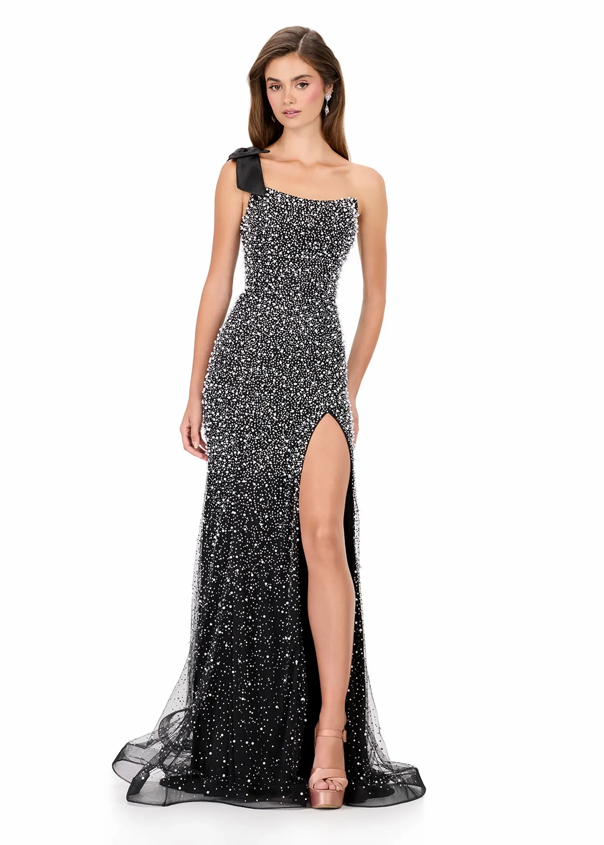 Make a statement in this glamorous one-shoulder gown with bow detail. ASHLEYlauren Style 12157 is adorned with heat set stones, and pearls. The fitted silhouette and slit create a modern, elegant look, while the dramatic horsehair hem adds volume and movement. A perfect choice for pageant, prom, or any event where you want to shine.