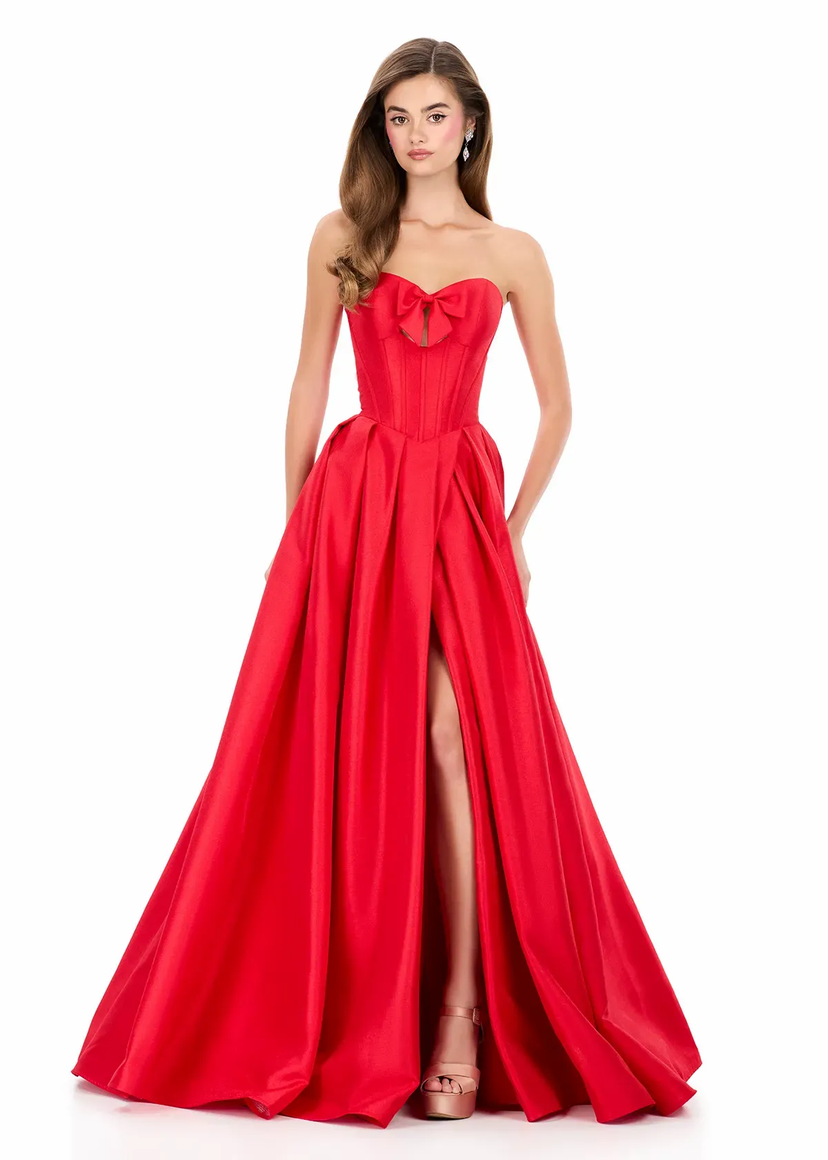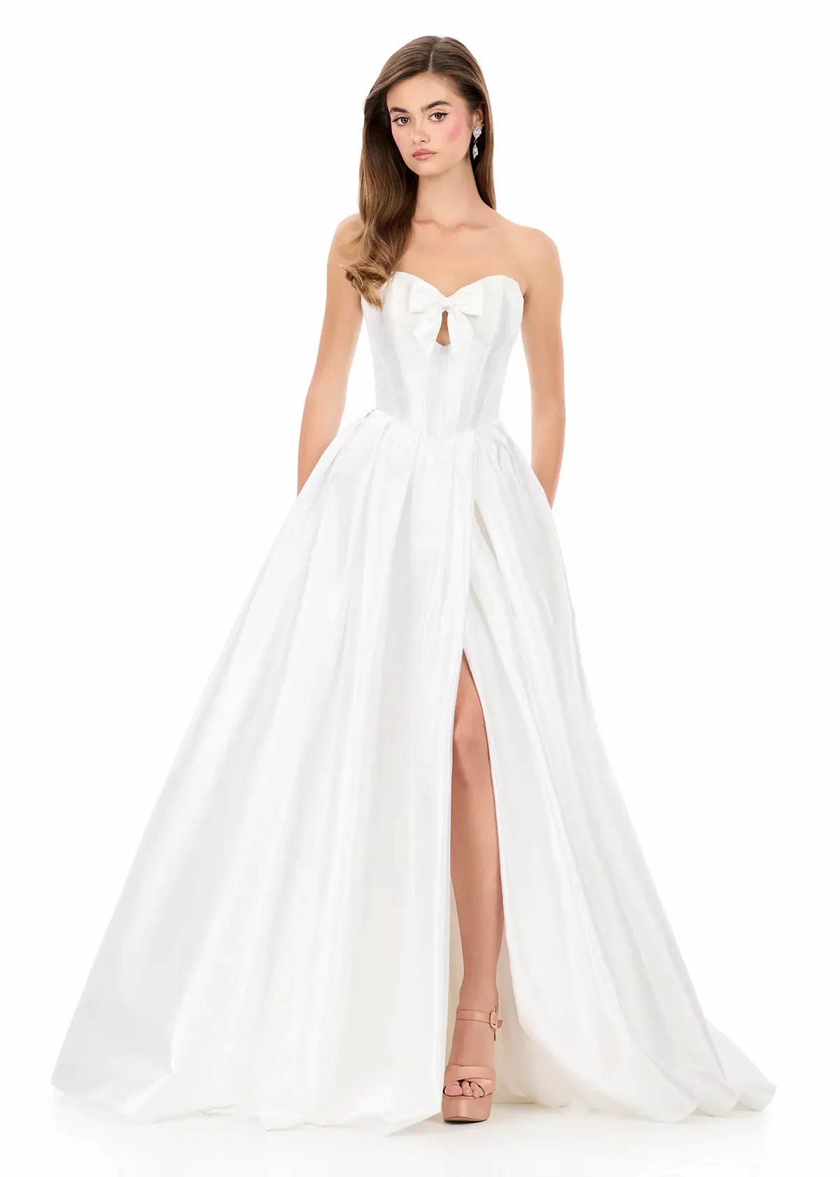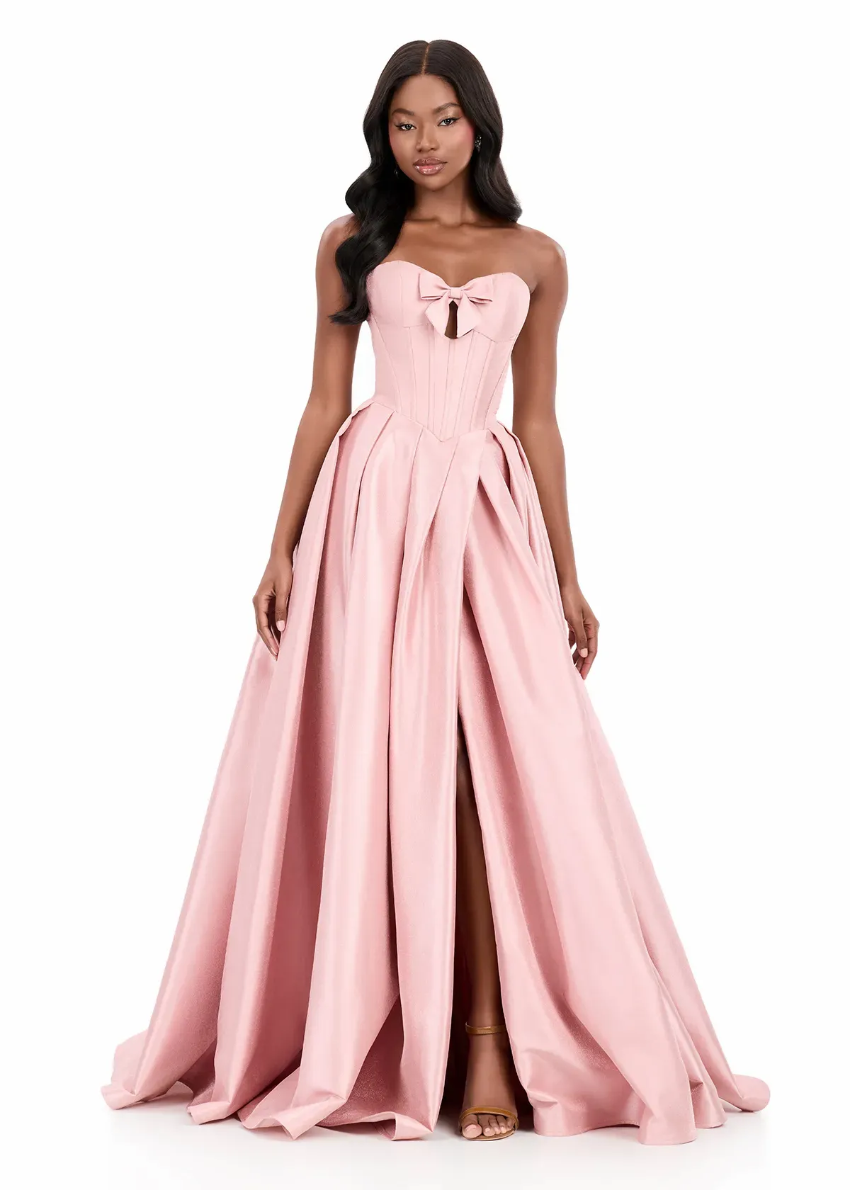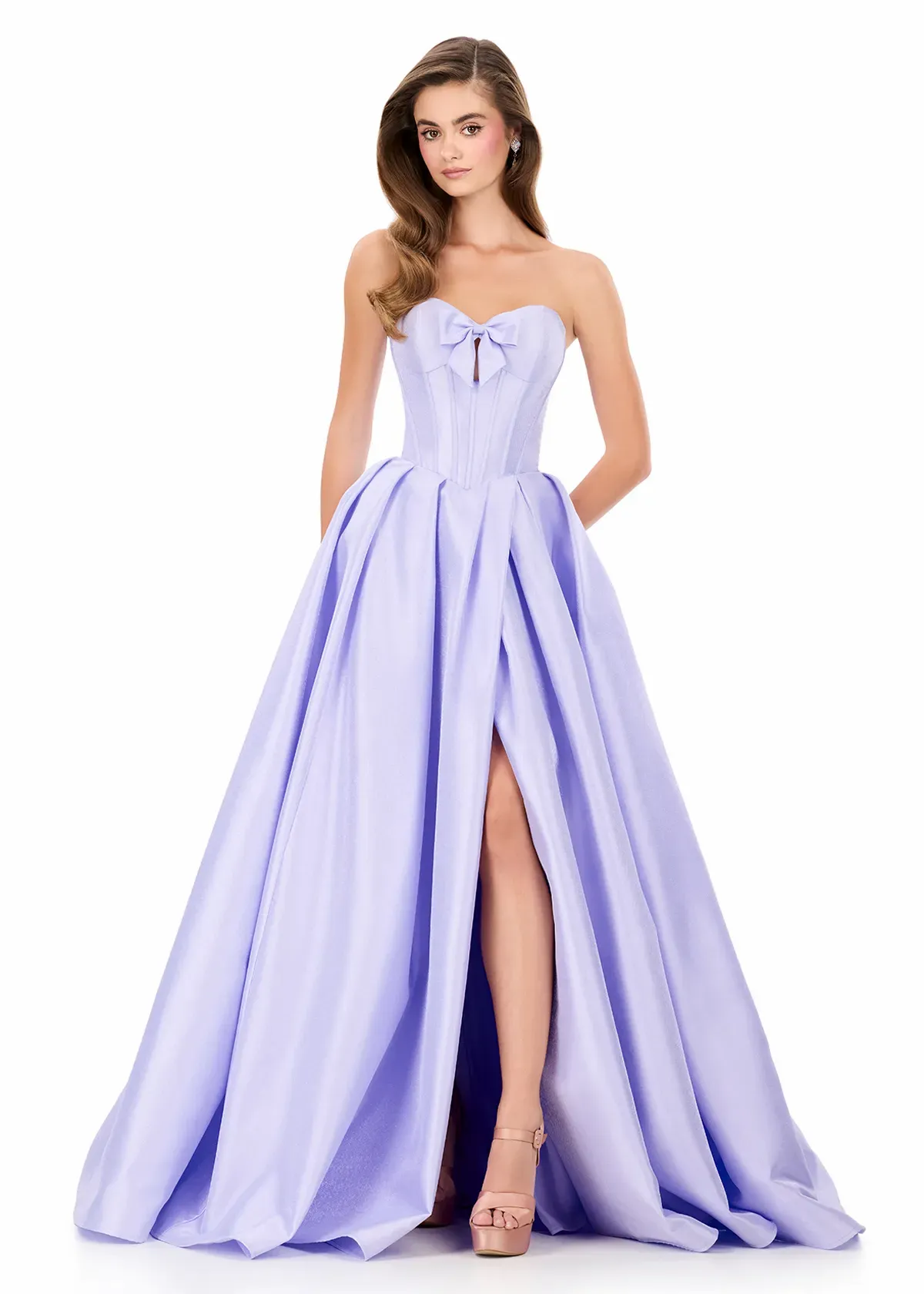 Be regal and refined in this Mikado ballgown designed to make a grand entrance. The ASHLEYlauren Style 12264 strapless bodice features a delicate bow detail and structured seams that flatter the waistline, while the full skirt showcases dramatic box pleats for maximum volume and movement. Hidden slit detailing adds a touch of modern edge to this otherwise classic silhouette, making it a perfect balance of timeless elegance and fresh design.