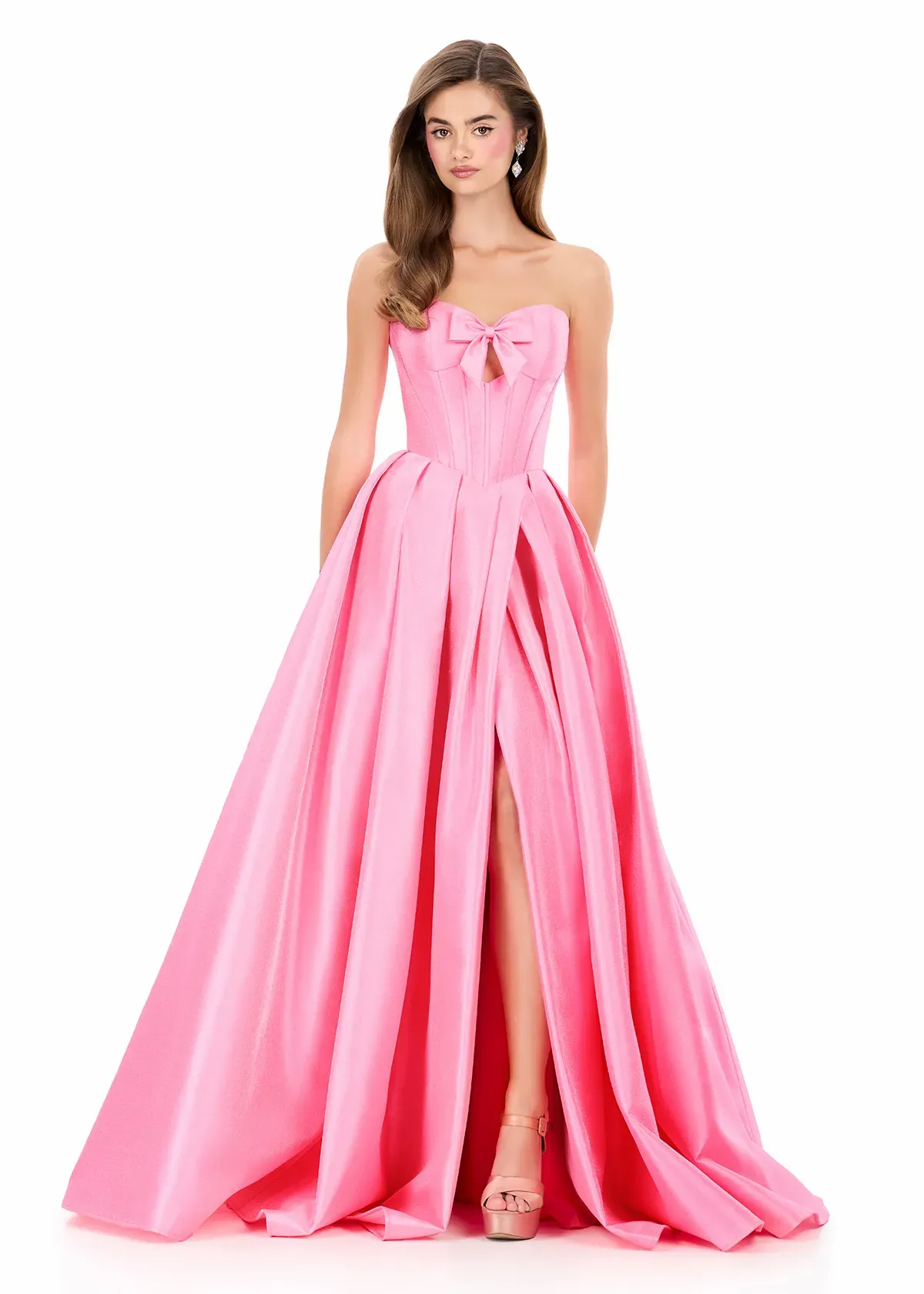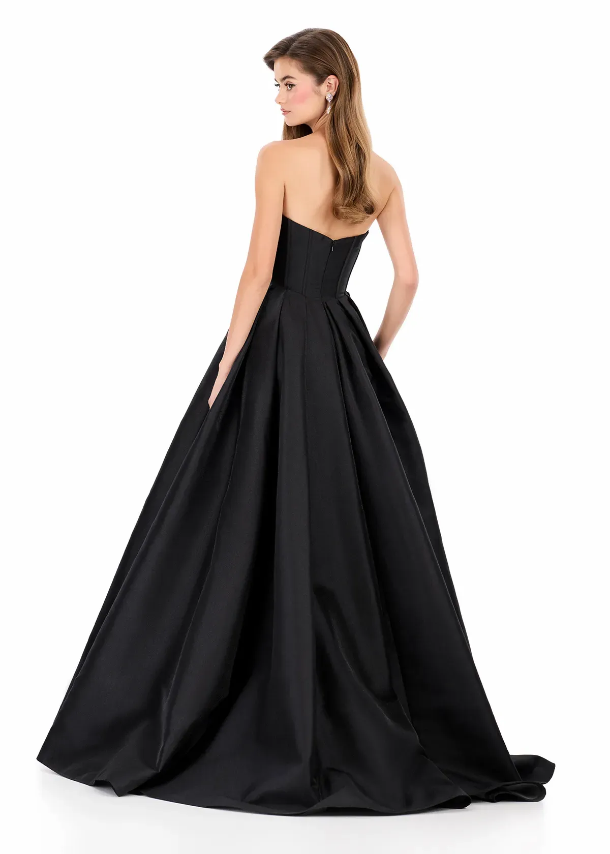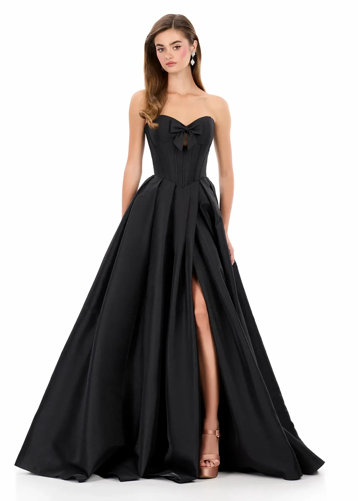 Be regal and refined in this Mikado ballgown designed to make a grand entrance. The ASHLEYlauren Style 12264 strapless bodice features a delicate bow detail and structured seams that flatter the waistline, while the full skirt showcases dramatic box pleats for maximum volume and movement. Hidden slit detailing adds a touch of modern edge to this otherwise classic silhouette, making it a perfect balance of timeless elegance and fresh design.