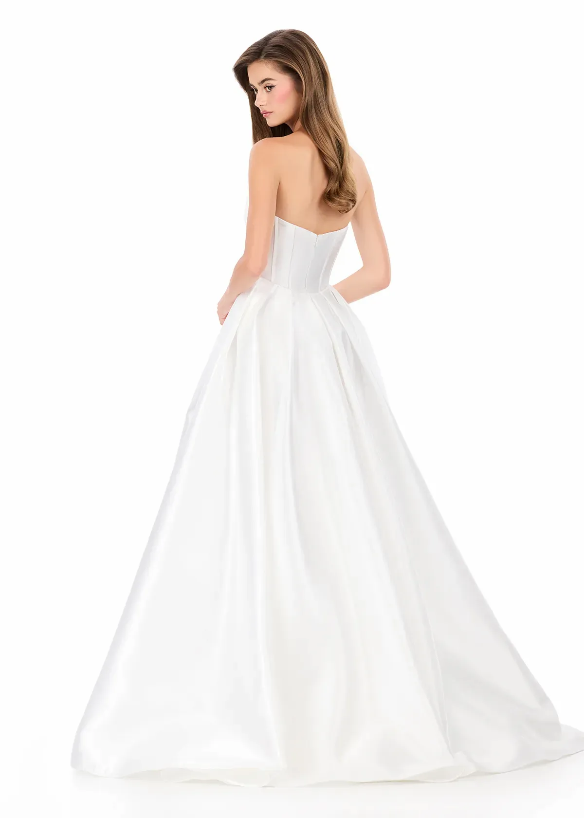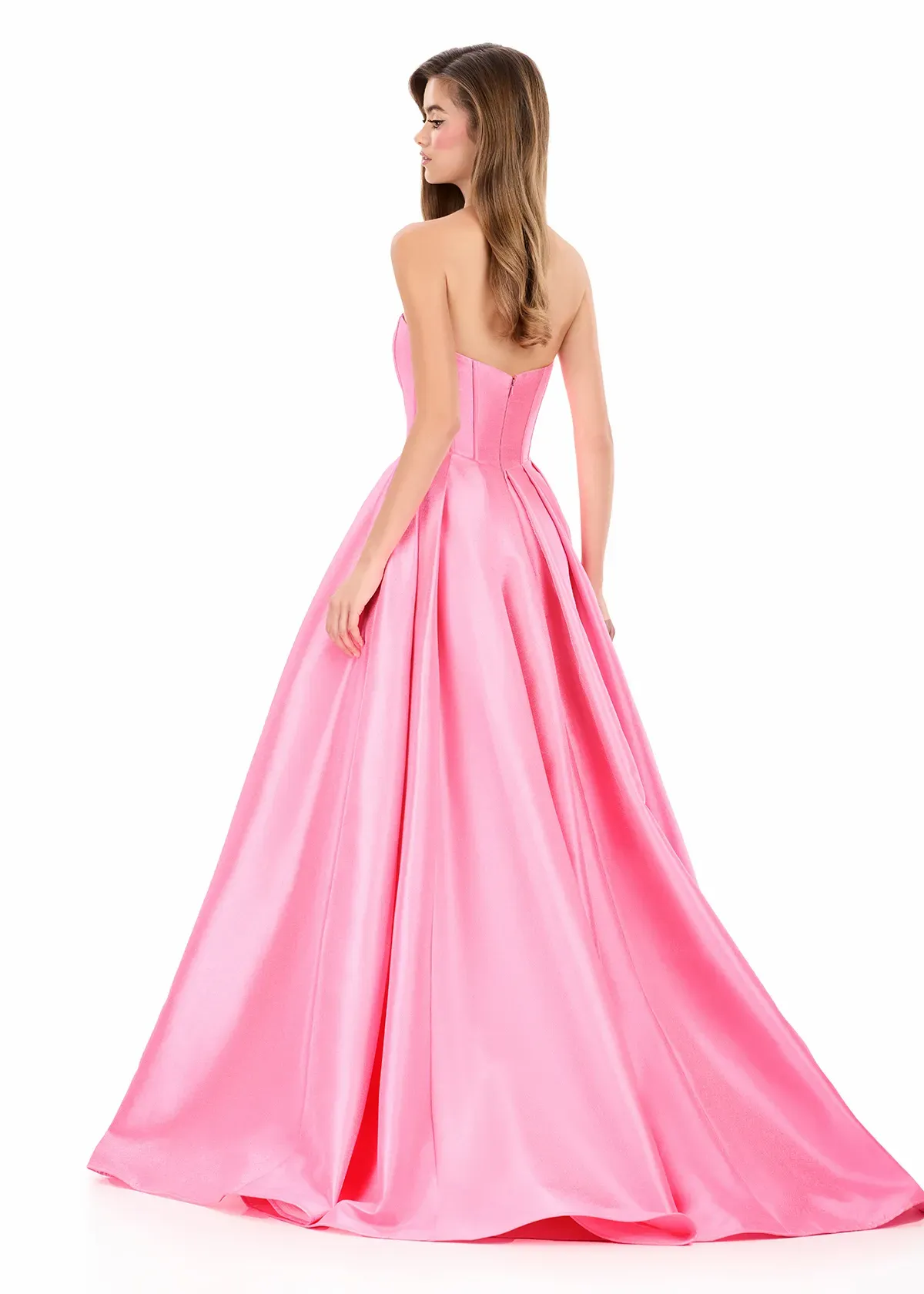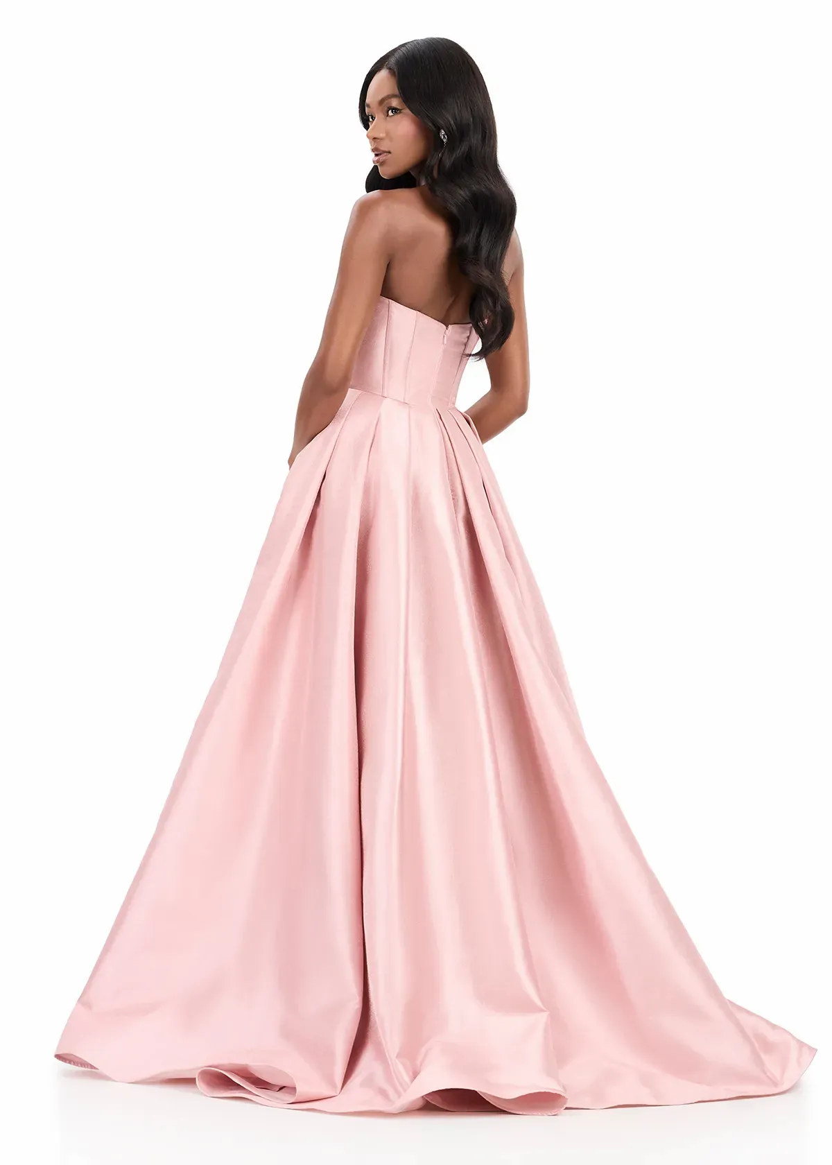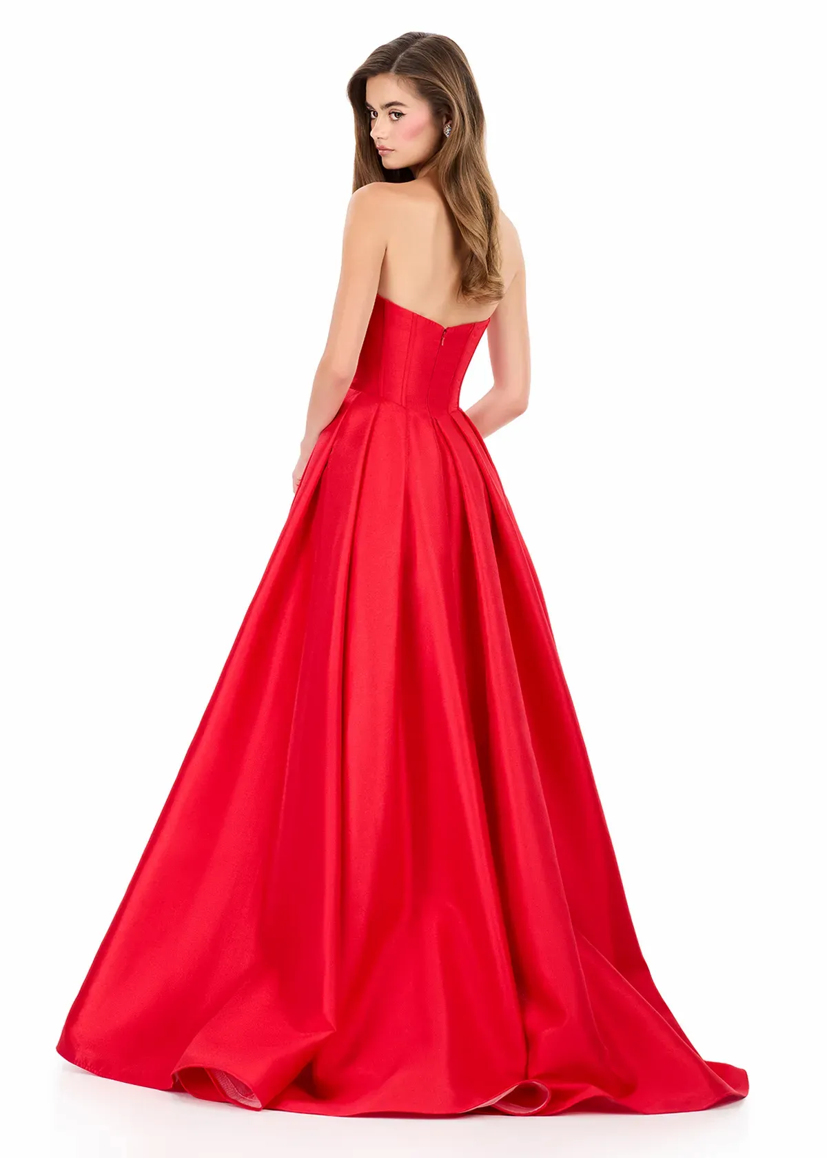 Be regal and refined in this Mikado ballgown designed to make a grand entrance. The ASHLEYlauren Style 12264 strapless bodice features a delicate bow detail and structured seams that flatter the waistline, while the full skirt showcases dramatic box pleats for maximum volume and movement. Hidden slit detailing adds a touch of modern edge to this otherwise classic silhouette, making it a perfect balance of timeless elegance and fresh design.