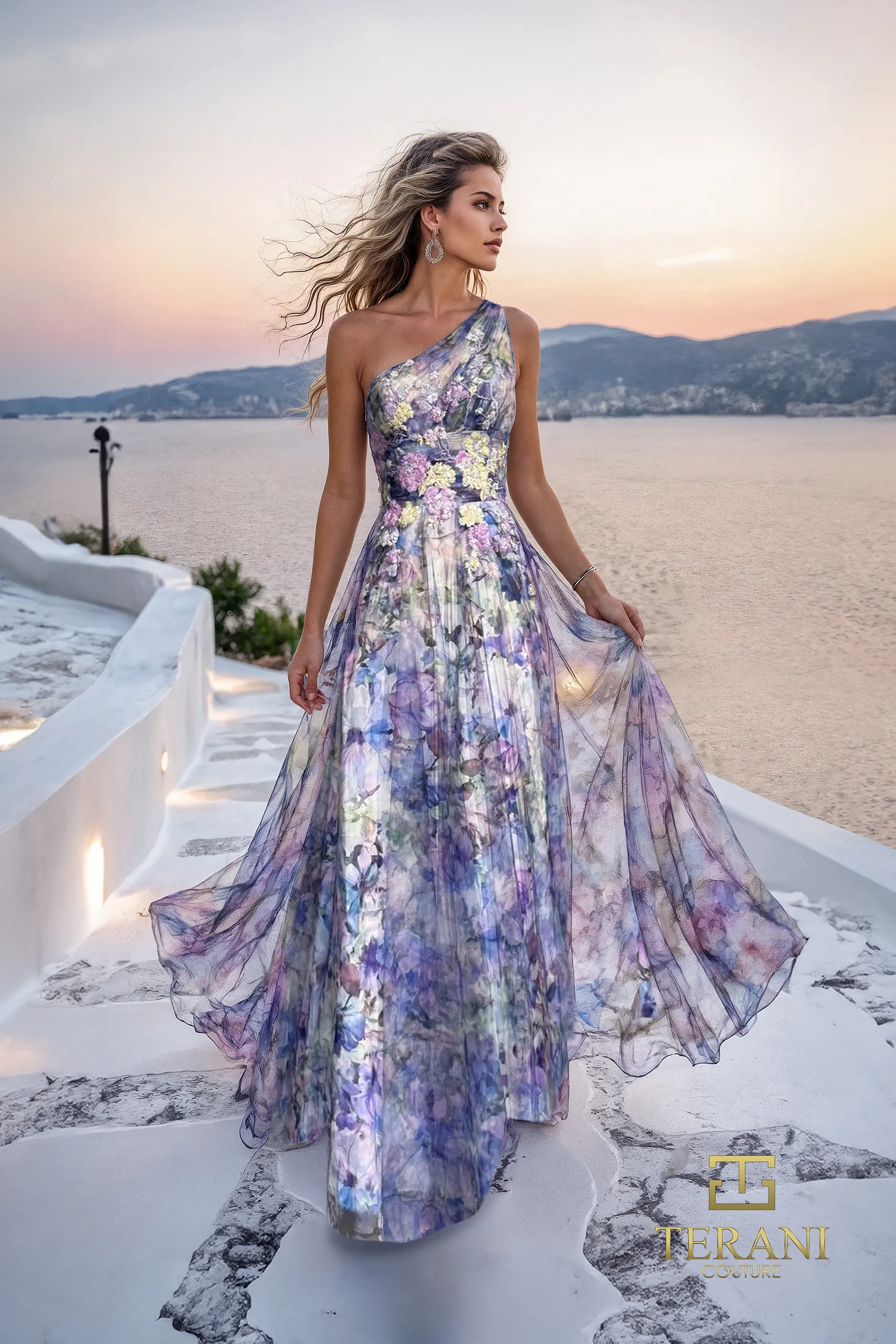 261P6696 Long A-Line Prom Dress is an enchanting one-shoulder gown that captures the essence of romance and elegance. Crafted from flowing printed chiffon in dreamy Blue Purple hues, it features an asymmetrical neckline that adds a modern edge to its classic silhouette. The cinched waist flows into a full A-line skirt, creating graceful movement with every step. Designed with a center-back zipper and hook-and-eye closure for a secure fit.